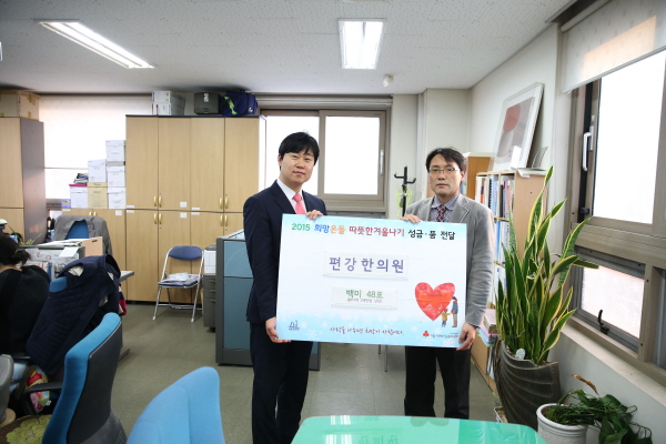 서초구와 서울 사회복지공동모금회가 함께하는 ‘2015 희망온돌 따뜻한 겨울나기 성금‧품 전달’을 위해 쌀 48포를 기부한 것이다. 편강한의원은 매년 주위에 불우이웃을 돕고자 기부행사에 적극 참여하고 있다.